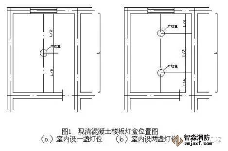 ⑴在配管前應按設計圖紙確定好配電設備、各種箱、盒及用電設備位置。在樓板內配管時,在土建摸板支設完畢后,根據設計圖紙在摸板上用紅油漆標注燈具、插座、探測器、接線盒、配電箱的位置。當室內只有一盞燈時,其燈位盒應設在縱橫墻(或梁)凈尺寸中心線的交叉處;有兩盞燈時,燈位盒應設在短軸線墻(或梁)凈尺寸中心線與長軸線墻(或梁)凈尺寸1/4 的交叉處,如圖1 所示。公共建筑走廊照明燈具,應按其頂部建筑結構不同,來合理地布置燈位盒的位置,當走廊頂部無凸出樓板下部的梁時,除考慮好樓梯對應處的燈位盒外,其他燈位盒宜沿走廊中心線均勻分布,如走廊頂部有凸出樓板下部的梁,確定燈位時,應考慮到燈位與梁的位置關系,燈位盒與梁之間的距離應協調,均勻一致,力求實用美觀。