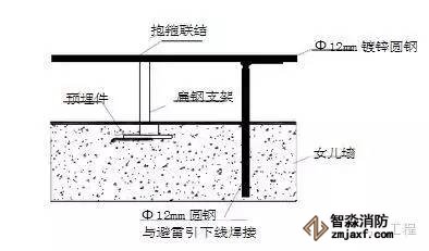 1.首先在屋面結構鋼筋綁扎時,從避雷引下線柱鋼筋引出Φ12mm鍍鋅圓鋼與屋面避雷帶連接,其接點做法見圖: