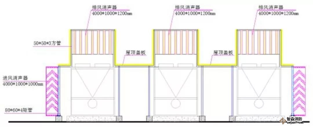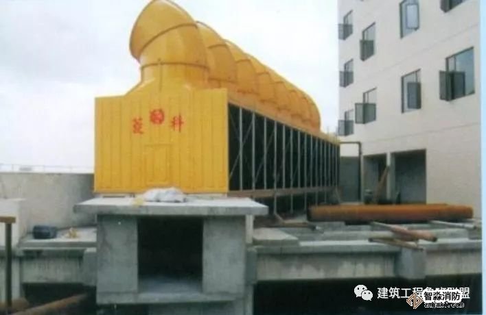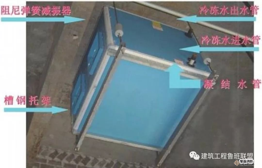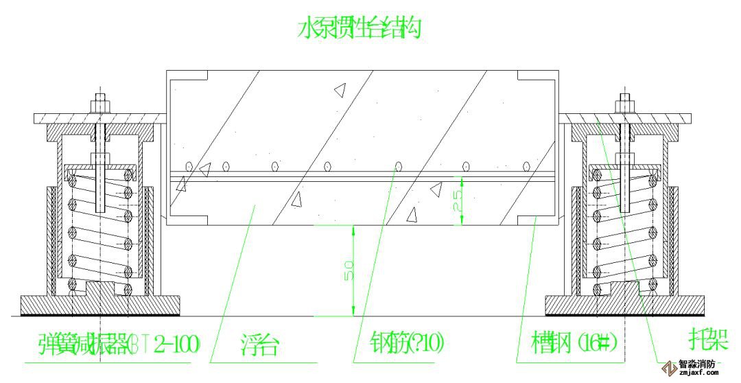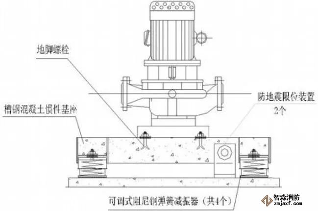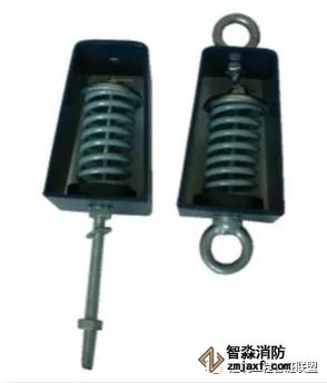 為防止軸流風機工作時擺動,用槽鋼做成框架固定在樓板上,圖為排風兼排煙風機下部設置阻尼彈簧減震器