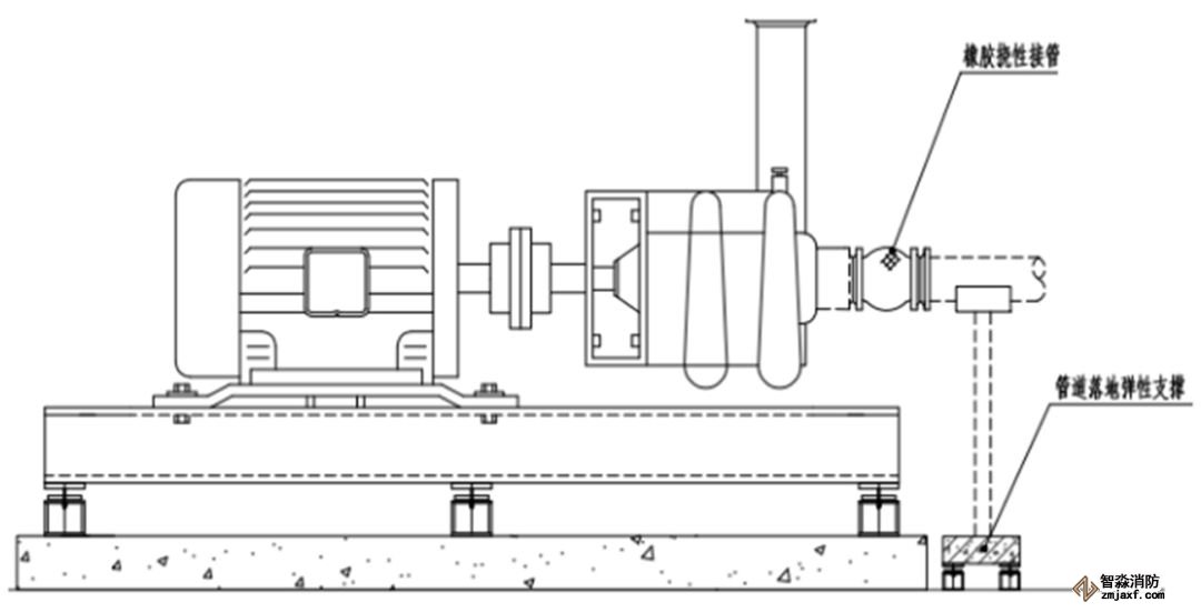 冷水機組底座設置彈簧減震器,落地支架應安裝在柔性短管的后側