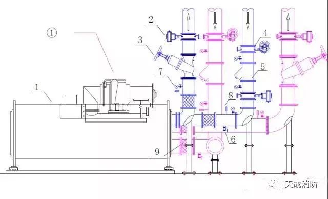 冷水機組常規接管圖:1-冷水機組,2-電動閥,3-平衡閥,4-蝶閥,5-Y 型過濾器,6-泄水閥,7-壓力表,8-溫度計,9-軟接頭。