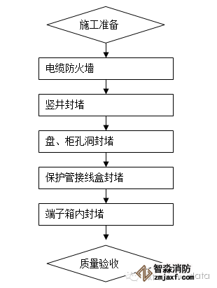 (2) 技術準備:核對施工圖 , 確認各類的封堵方式符合設計及規范要 求;防火封堵材料必須具有國家防火建筑材料質量監督檢驗測試中心提供 的合格檢測報告,并通過省級以上消防主管部門鑒定 , 并取得消防產品登記備案證書。