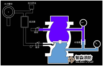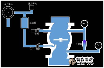 由供水設備(如穩壓泵、高位水箱)供水,使系統充滿設計要求的壓力水,濕式報警閥閥瓣因自身重力而關閉。本系統在此狀態下,允許供水系統有波動,但不至于誤報。