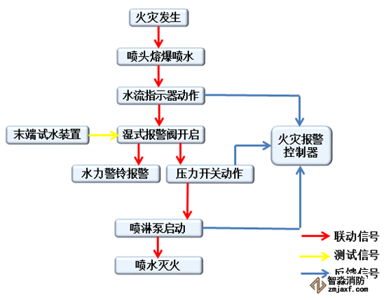 當保護區域內發生火災,環境溫度不斷上升,當環境溫度達到閉式噴頭動作溫度時,噴頭動作,灑水滅火。使管網一側(系統側)水壓下降,濕式報警閥閥瓣因上下壓差而開啟,向系統供水滅火。水流指示器因水流作用而動作,火災報警控制器收到水流指示器的反饋信號