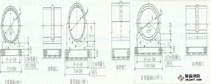 混凝土帶形基礎楚沿管道全長鋪設的基礎,分為90、135、180的管座形式。