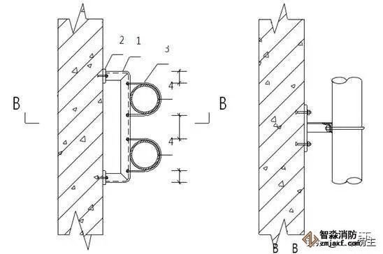 1.角鋼 2.連接板(10mm,做為承重支架,當使用80以上的角鋼時采用) 3.管碼 4.管道
