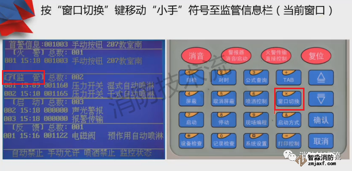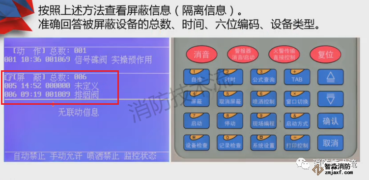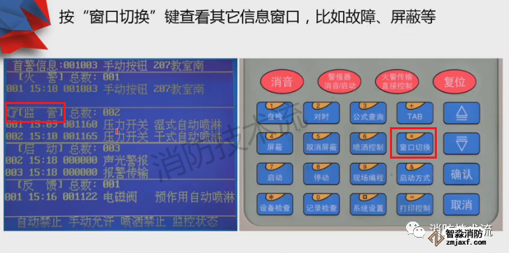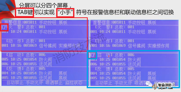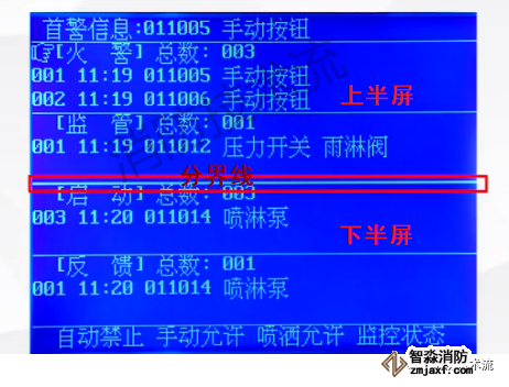 顯示屏分上、下半屏,上半屏為火警、監管、故障、屏蔽等屬于報警信息,下半屏為啟動、反饋、動作等屬于聯動信息