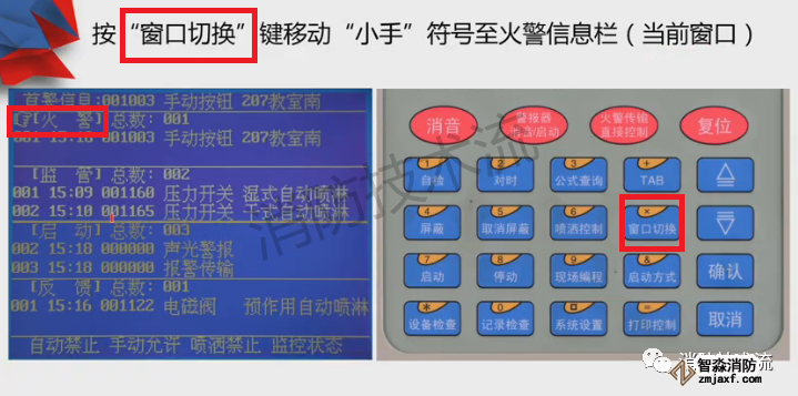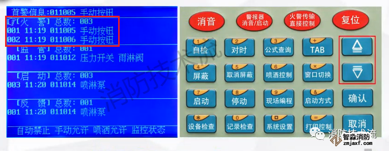 當某個類型信息總數超過2條時,可通過上下鍵翻動查看,例如火警信息總數是3,可通過按下翻鍵查看第三條火警信息